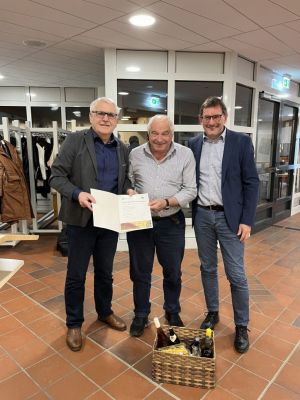 Kreisvorsitzender Kalli Appelmann (li.) und SWFV-Vizepräsident Lothar Renz (re.) überreichen Franz Gritzner (Mitte) die DFB-Ehrenamtsurkunde und die dazugehörige Ehrenamtsuhr.
