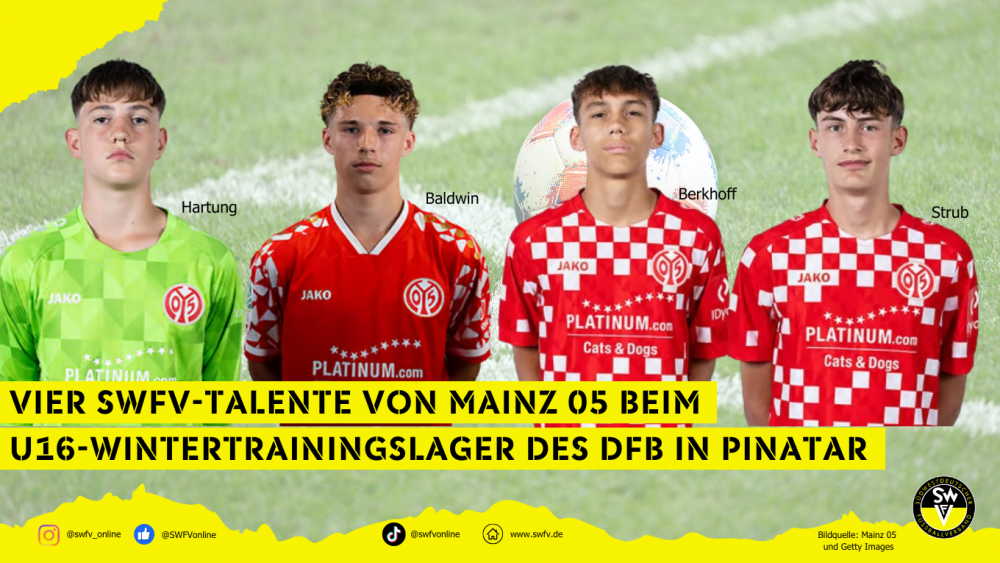 Vier Nachwuchsspieler aus dem Zuständigkeitsbereich des Südwestdeutschen Fußballverbandes wurden für das U16-Junioren-Wintertrainingslager des DFB nominiert. Das Trainingslager findet vom 04. bis 15. Januar 2026 im spanischen Pinatar statt. Unter der Leitung von Cheftrainer Michael Prus sind folgende SWFV-Spieler vom 1. FSV Mainz 05 mit dabei: Nick Hartung, Kevin Baldwin. Jonas Berkhoff und Jona Emil Strub.