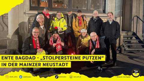 Mit dem Putzen der Stolpersteine vor der Boppstraße 64 setzt der FC Ente Bagdad ein Zeichen gegen Antisemitismus sowie für Vielfalt und Demokratie. Ulrich Rüther vom FC Ente Bagdad blickte in seiner Ansprache noch einmal auf das Leben und Wirken von Eugen Salomon zurück. Daniel Meuren, Aufsichtsratsmitglied beim 1. FSV Mainz 05, betonte noch einmal die Bedeutung von Eugen Salomon für den Fußball in Mainz.