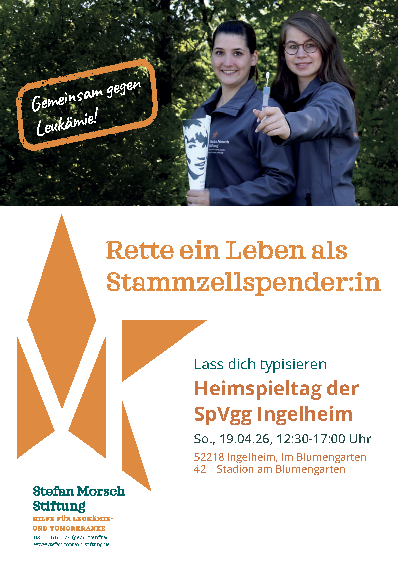 Fußball ist mehr als nur ein 1:0 – Fußball ist Gemeinschaft und Verantwortung. Unter diesem Motto lädt die Spielvereinigung Ingelheim am 19. April 2026 zu einem ganz besonderen Heimspieltag ein. Gemeinsam mit der Stefan-Morsch-Stiftung setzt der Verein ein Zeichen im Kampf gegen Blutkrebs. Der gesamte Eintritt wird der Stefan-Morsch-Stiftung gespendet!