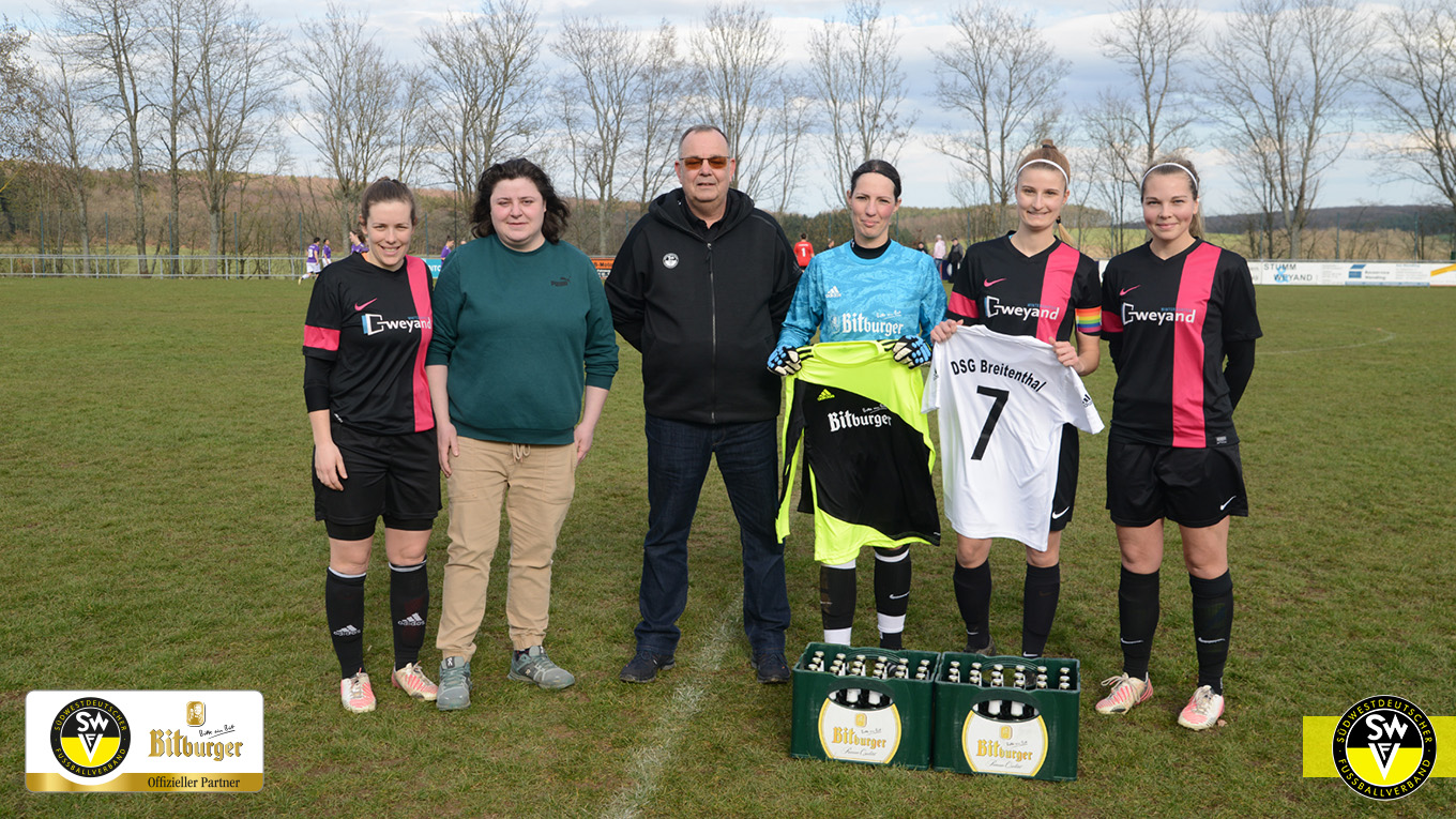 Am 17. Spieltag der Frauen Verbandsliga Südwest besuchte der Kreisvorsitzender des Fußballkreises Birkenfeld Axel Rolland die Partie DSG Breitenthal 95 e.V. gegen den 1. FFC Kaiserslautern und übergab den lang ersehnten Trikotsatz des Partners Bitburger des Südwestdeutschenfußballverbandes. Die DSG Breitenthal war der Gewinner des Kreises Birkenfeld in der Trikotaktion von Bitburger. Der Vorsitzende des Fußballkreises stellte auch die Besonderheit beider Mannschaften hervor. Beide Frauenteams sind reine Frauenfußballvereine. Die DSG seit 1995 und der 1.FFC seit 2017.