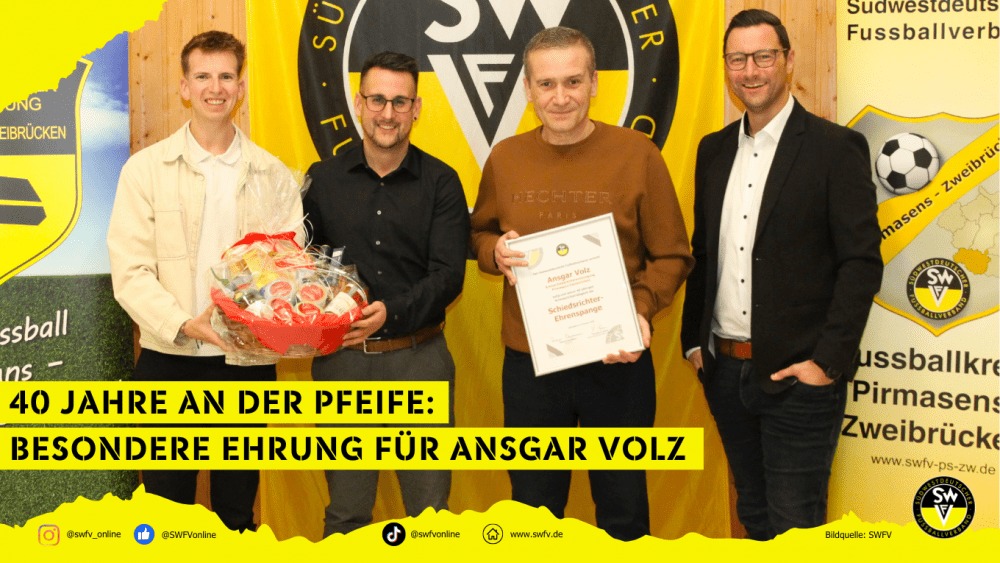 Für seine 40-jährige Tätigkeit als Schiedsrichter wurde Ansgar Volz mit der „Schiedsrichter-Ehrenspange“ des Südwestdeutschen Fußballverbandes (SWFV) ausgezeichnet. Eine beeindruckende Zeitspanne, in der Ansgar unzählige Spiele geleitet und den Fußball in unserer Region maßgeblich mitgeprägt hat.