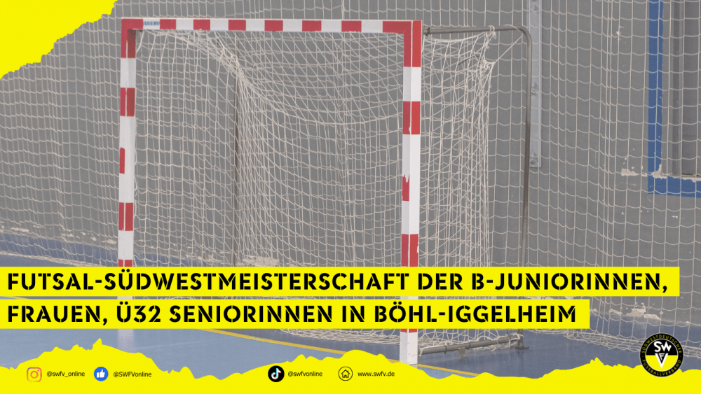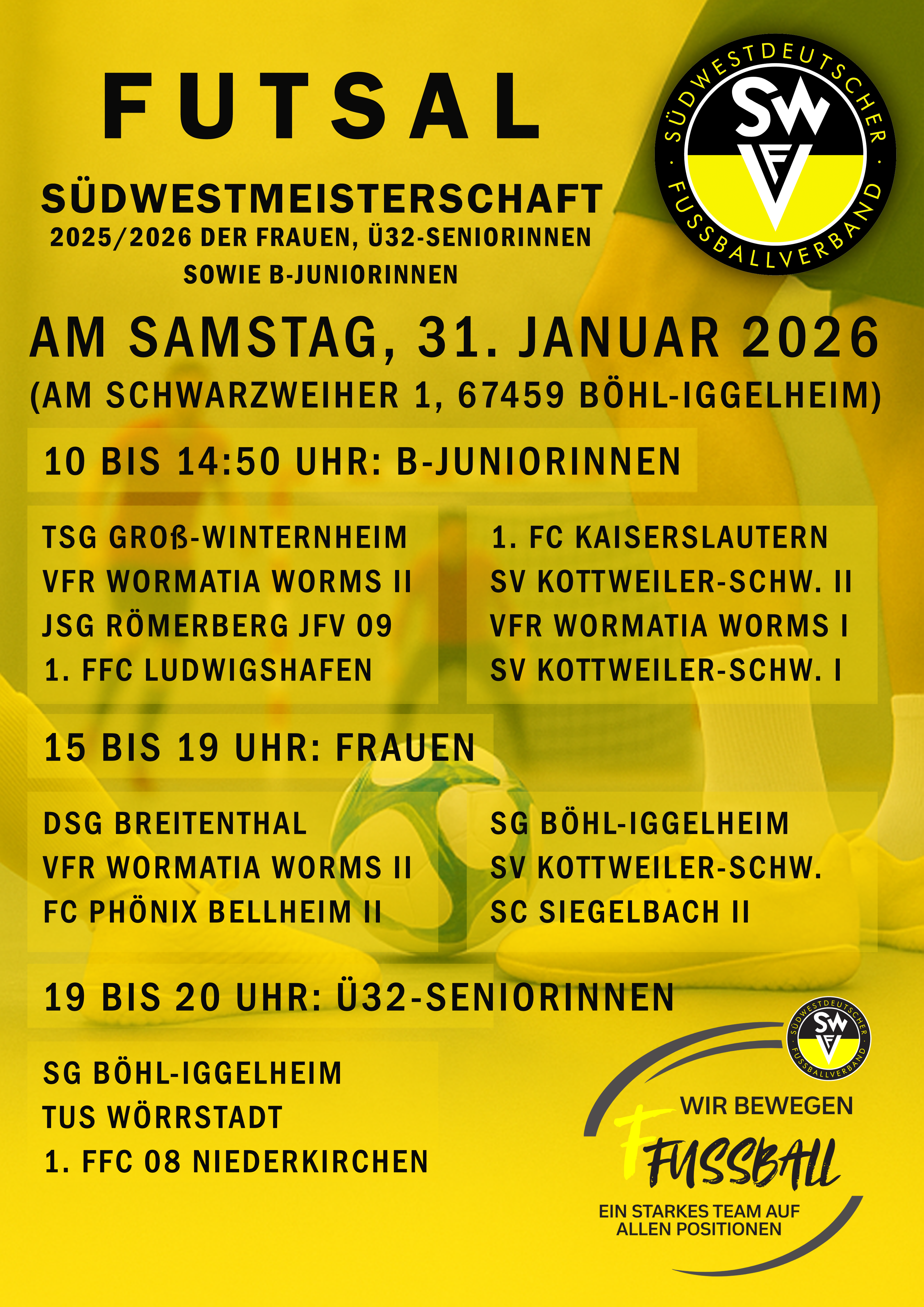 Am Samstag, 31. Januar 2026, finden in Böhl-Iggelheim (Am Schwarzweiher 1) die Futsal-Südwestmeisterschafen der B-Juniorinnen, der Frauen sowie der Ü32-Seniorinnen statt. Der Tag beginnt mit der Futsal-Südwestmeisterschaft der B-Juniorinnen um 10:00 Uhr.