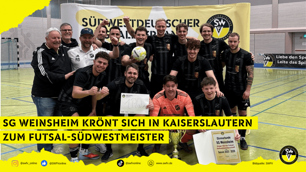 Am Sonntag, den 08.02.2026, fand in der Barbarossahalle in Kaiserslautern die Futsal-Südwestmeisterschaft der Herren statt. Acht Teams – sieben Qualifikanten aus den Vorturnieren sowie die einzige reine Futsal-Mannschaft des SWFV, die TSG 1846 Mainz – lieferten sich einen langen, intensiven und hochklassigen Turniertag.
