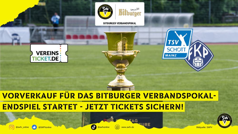 Der Ticketvorverkauf für das diesjährige Bitburger Verbandspokalendspiel 2026 ist gestartet! In diesem Jahr kommt es erneut zum Duell zwischen dem TSV Schott Mainz und dem FK 03 Pirmasens. Austragungsort ist wie im Vorjahr Weingarten in der Pfalz, wo sich zuletzt der FK 03 Pirmasens den Titel sichern konnte. Die genaue Anstoßzeit wird noch bekannt gegeben.