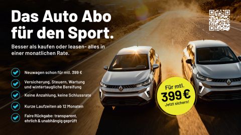 Seit 28 Jahren Partner des Sports – und heute dein Partner für neue Wege: Mit dem Renault Auto Abo holst du dir nicht einfach nur ein Auto, sondern ein Lebensgefühl. Steig ein, dreh den Schlüssel und spür das französische Flair – ob im Renault Captur oder im Renault Symbioz. Und das Beste: Schon für 399 € im Monat bist du dabei.